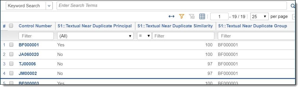 • S1::Textual Near Duplicate Principal - identifies the principal document with a "Yes" value. The principal is the largest document in the duplicate group. It acts as an anchor document to which all other documents in the near duplicate group are compared.