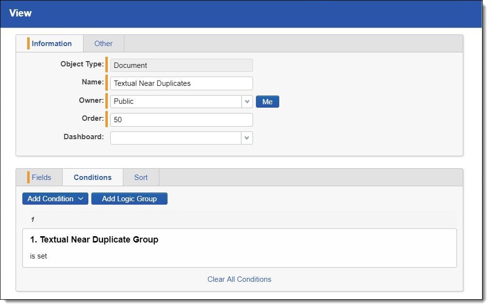 2. Add a condition to only show documents where the Textual Near Duplicate Group field is set.