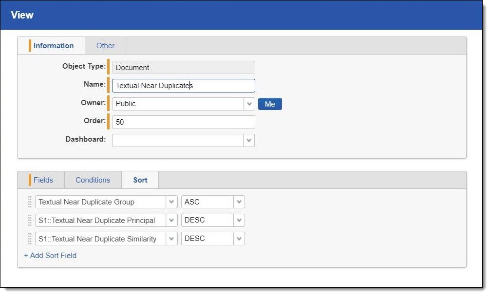 • Textual Near Duplicate Group - the identifier for a given group of textual near duplicate documents. This is a relational field which provides relational capabilities. However, you can map S1::Textual Near Duplicate Group to any relational field when you set up the Structured Analytics Set.