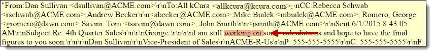 - In pattern matching, the symbols “^” and “$” match the beginning and end of the full file, not the beginning and end of a line. If you want to indicate a line break when you construct your RegEx, use the sequence “\r\n”. Whether or not you will have line breaks in your expression depends on what you are trying to match. Line breaks can be useful “anchors” that define where some pattern occurs in relation to the beginning or end of a line. Note that some Analytics operations do not pay attention to line breaks. For example, textual near duplicate identification. While others are very sensitive. For example, email header parsing in name normalization or email threading. The first image shows extracted text in the viewer followed by the same text in the Analytics pipeline.