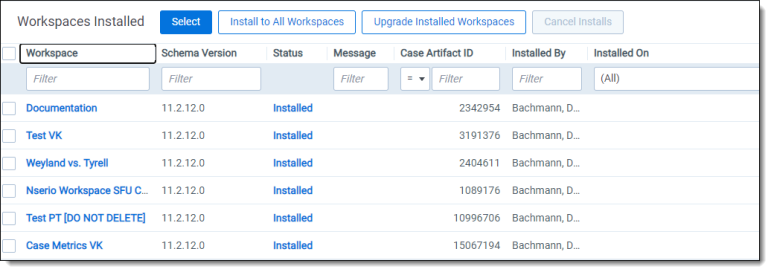 7. These workspaces now contain the application. Relativity lists the workspaces in the Workspaces Installed section on the detail view of the application.