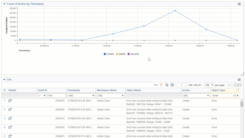 This use case highlights how to identify patterns of errors over time. Use the timestamp widgets to see if there are a consistent amount of errors occurring during a specific time of day. By using a few different filtering methods - directly in the List, on a widget, adding conditions - you can view patterns of errors specific to services, agents, etc. with Relativity to see if something is consistently causing users issues in Relativity.
