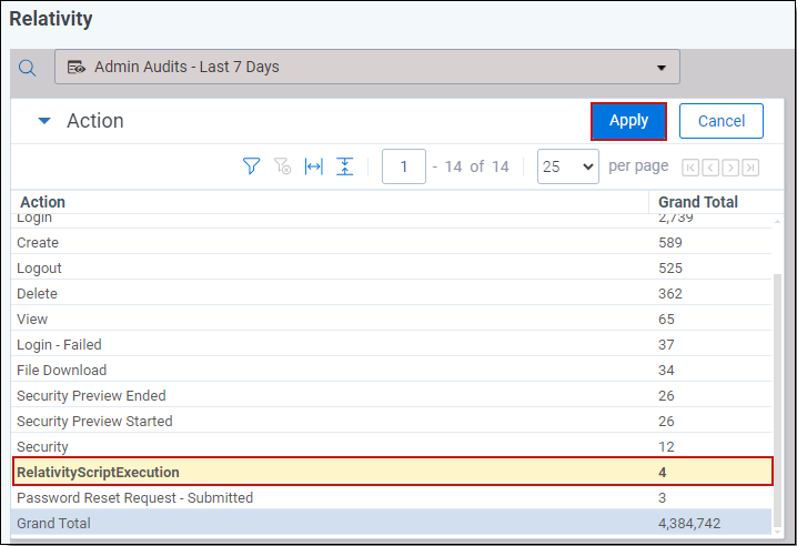- In the List view of the Audit tab, filter under the Action column for RelativityScriptExecution.