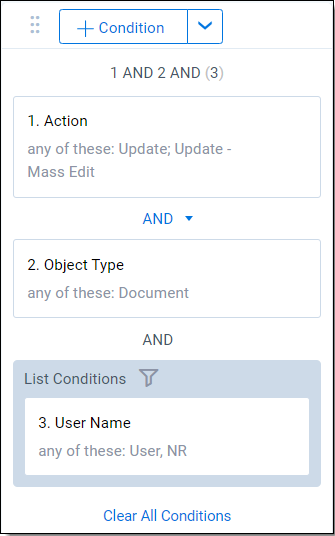 You can also add a condition to filter on the Object Name field for a specific component of Relativity. Selecting the Object Name field gives you a free text search back. You can specify a specific string or set of string along with the is like operator to filter for errors for a specific component.