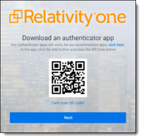 Prior to logging in, if you have not already, download the required two-factor authentication app. When using the authenticator app for the first time, Relativity will need to connect your profile to the app.