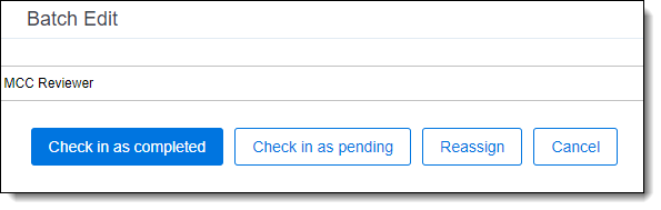 Reviewers can check out batches one at a time but they may assign multiple batches to themselves or others as needed. A batch may also be checked out for as long as desired. Reviewers need to check in the checked out batch as Completed or Pending before they can check out another. A batch that has been checked in as completed can still be checked out again. For more information on checking in a batch, see Reassign a batch or check a batch in.
