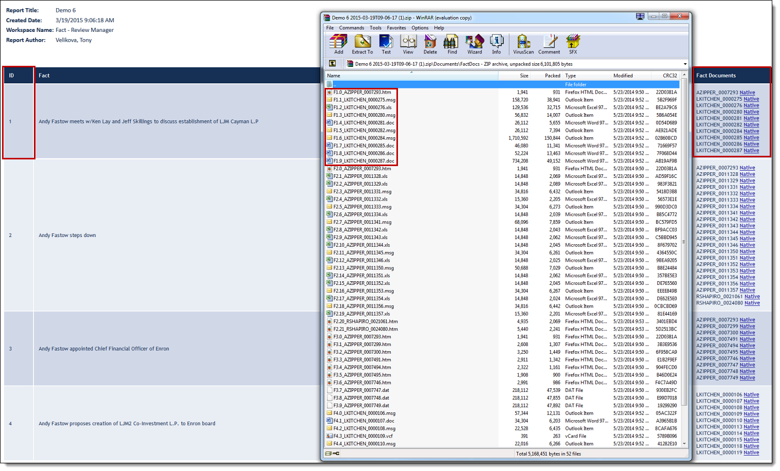 The Documents folder in the .ZIP file contains a list of files that are referenced in the offline report. There is only a single copy of a referenced file in the ZIP. Therefore, if you have multiple facts or facts and issues linked to the same document, Relativity will only export a single copy of the file.