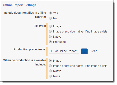 - When no production is available include - the document version included in the Offline report. Use these options in conjunction with the Production precedence field.