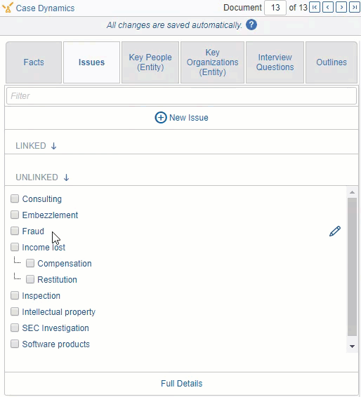 You can link two Case Dynamics objects such as a fact and an issue while reviewing documents in the Viewer. To link two Case Dynamics objects: