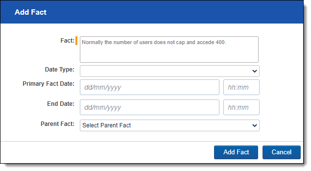 Optionally, type the @ symbol followed by one or more letters to bring up the type ahead feature. Case Dynamics presents a pop-up list of Entities based on the letters you type. Click the name of the Key Person or Key Organization to add them to the details of your Fact.