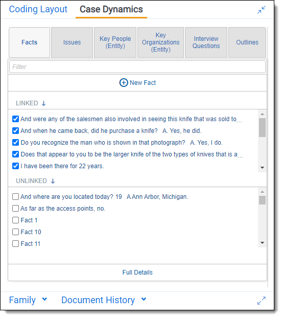 Click Case Dynamics icon in the coding layout to access the Case Dynamics coding pane. You can also access this functionality from the Transcripts layout when working with transcripts in the Transcripts application. For more information, see Working with Case Dynamics.