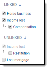 If a parent object is linked but the child object is unlinked, the text of parent object is light gray in the Unlinked section of the coding pane. This helps maintain family relationships while also noting that the parent object is linked. In the example below, Restitution, a child of Income lost, is not linked; however, Income lost is linked. This enables you to see that Restitution is a child of Income lost, which is unlinked.