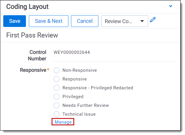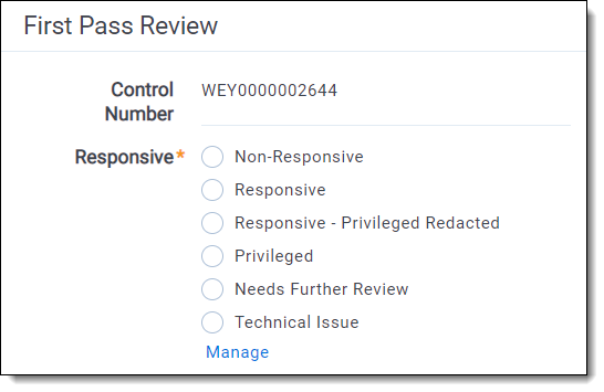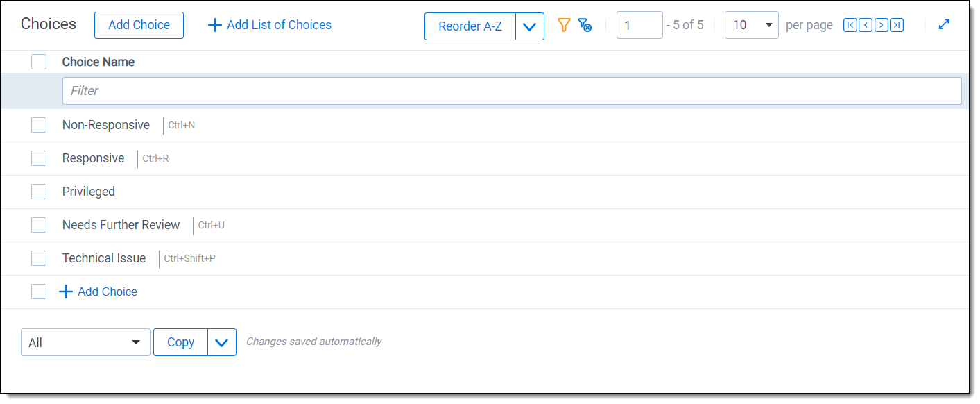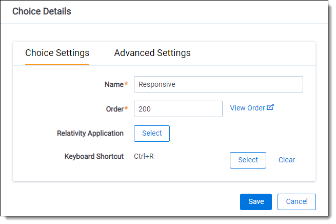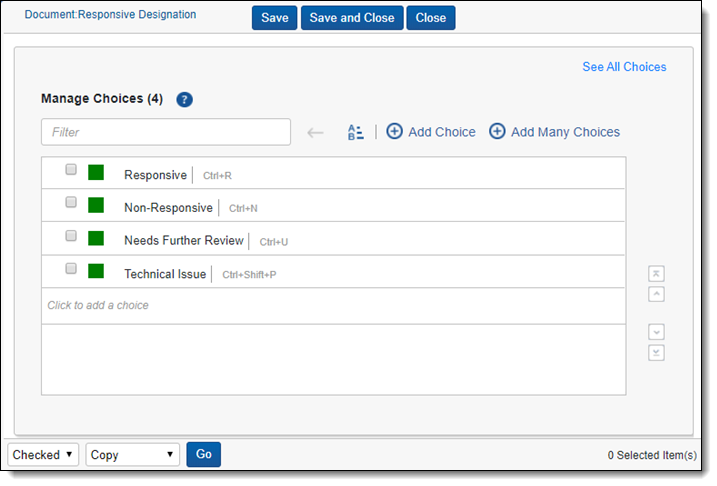 In a workspace, you use choices in coding fields to allow users to record decisions on a document. For example, a Responsiveness field might have choices like Responsive, Not Responsive, and Not Sure. You can add and edit workspace choices directly within Field forms and the Choices tab. Within the Field forms, any saved single or multiple choice field contains the choice editor, so you can create and manage choices directly within the field. Within, the Choices tab you may also add single or multiple choices, reorder choices, and create parent and child choices.