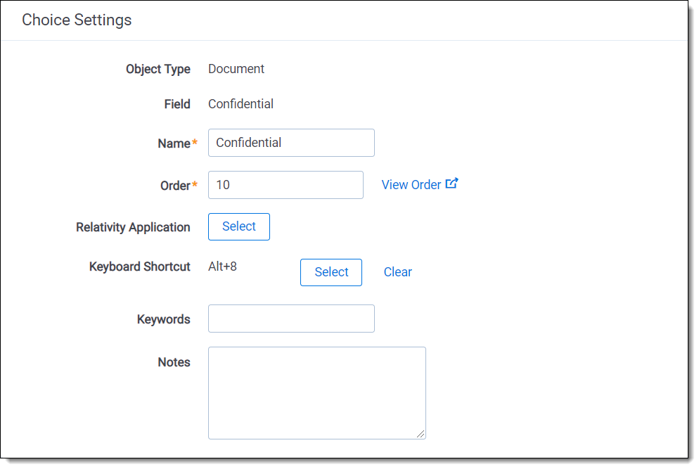 • Keyboard Shortcut - designates a keyboard shortcut for the document choice you're editing or creating. You can use the shortcut to code and edit documents in the Review Interface. You need to be in edit mode before you can use keyboard shortcuts for choices. This setting is only available for document fields and consists of the following checkboxes. You have to use Ctrl and/or Alt or you get an <Invalid Keyboard Shortcut> warning next to the Key drop-down field: