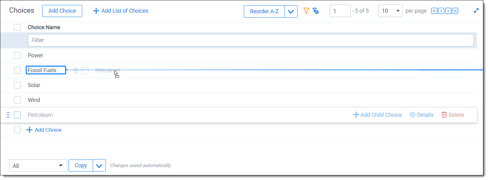 After you create a choice, you can edit the name and the details of the choice using the Choice editor.