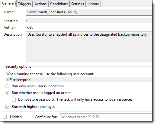 5. Specify the user account that runs scheduled tasks. The account can be the same one that runs the Elasticsearch Windows service.