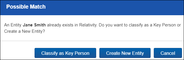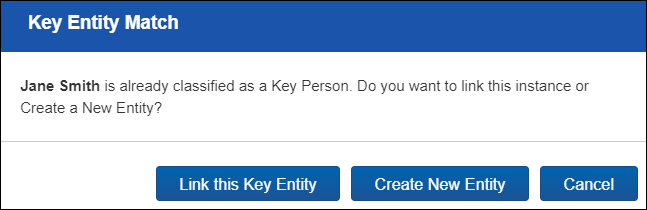 • Manually create a key entity in the Review Interface. A key entity is one that has the multi-choice field Classification set to either Key Person or Key Organization on the Entity object. These values are set automatically when you create an entity with either one of the respective views (Key People and Key Organization.) See Case Dynamics for more information on creating a key entity.