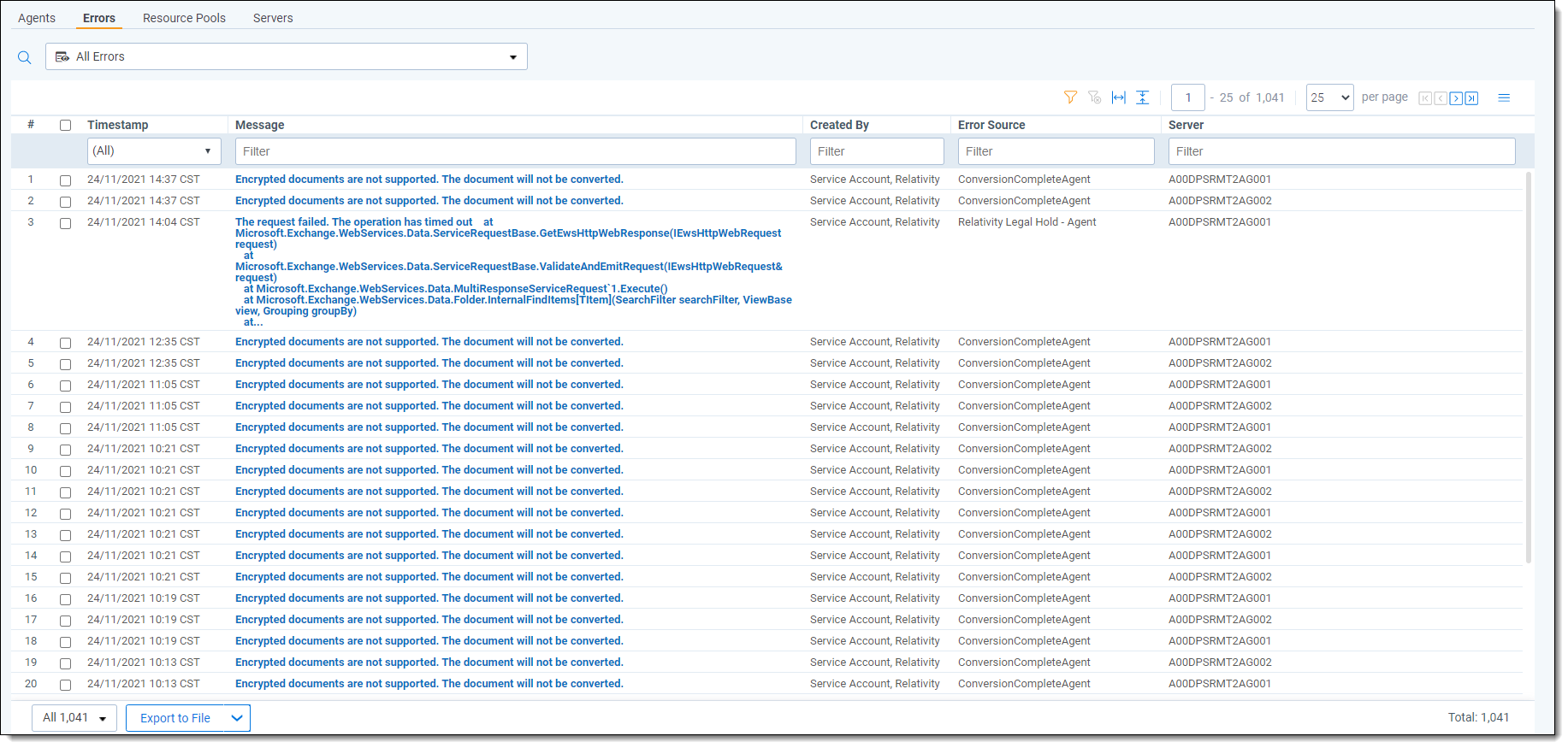 The Errors admin tab shows all the errors that have occurred in the Relativity environment. Due to the number of servers and features involved in your environment, it's possible for there to be thousands of items listed in this tab.