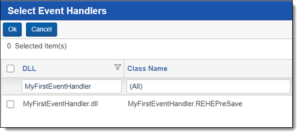 11. Select your event handler .dll, and click OK to add it to the Event Handlers section of the object type. The event handler now executes when a user performs a task on the layouts selected when you initially built the event handler.