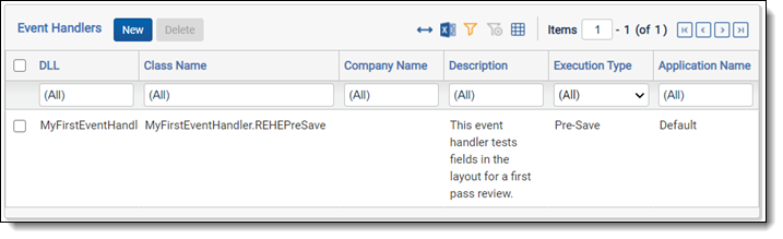 • Name—the name of the .dll file. Ensure that you enter a name, which is unique to your Relativity environment. On the Event Handler Express tab, the item list displays this name appended with additional text used to identify the .dll for your event handler. For example, if you entered MyEventHandler in the Name field, then the item list displays your event handler as MyEventHandler.REHEPreSave.