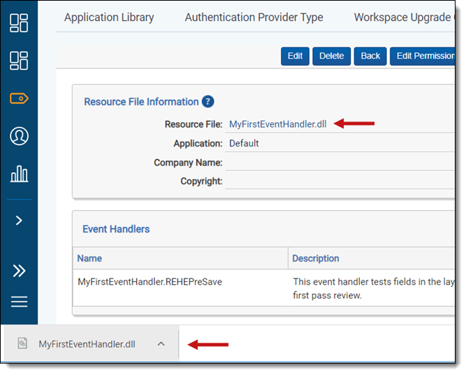 3. On the details view, double-click on your event handler's name in the Resource Files field. After your browser downloads the .dll file, save it to a location of your choice.