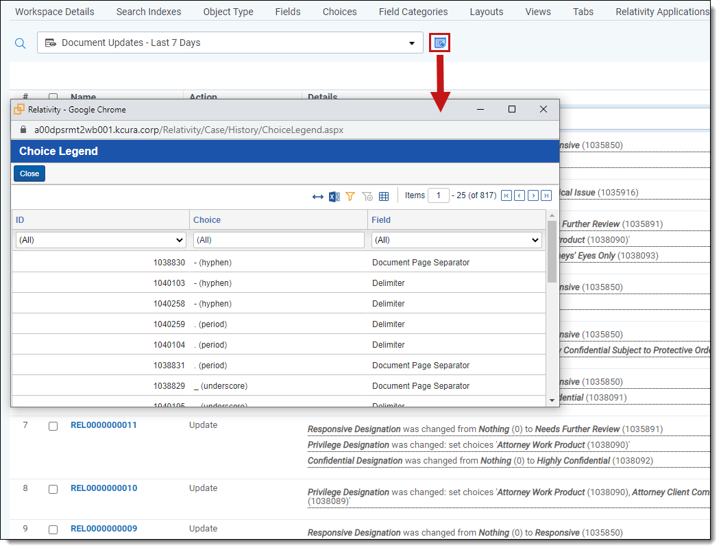 On the Choice Legend pop-up, you can search for choices in the workspace, their artifact IDs, and their associated fields. You can then enter Artifact ID listed for a choice value in the Details Filter and filter the audit records.
