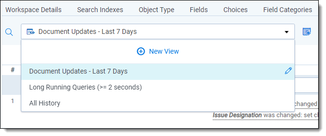 You can customize the views available on the History tab or create new views as necessary. The History tab includes pre-configured views for recently updated documents, long running queries, and imaging history, which you can modify.