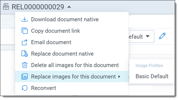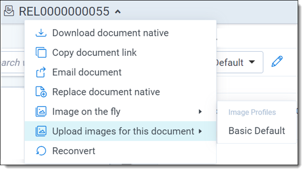 To upload an image for a file in the viewer, click the file name and select Upload images for this document. In the menu, select the imaging profile you want to upload the image with. For more information see, Imaging profiles.