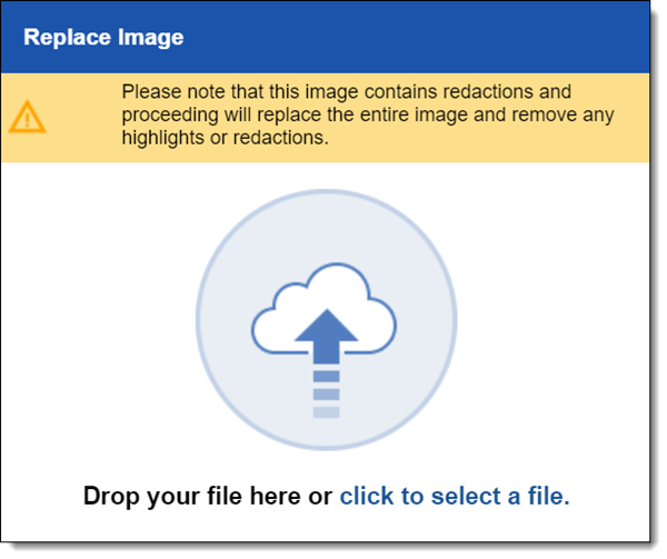 If you've redacted or added highlights to an image in the viewer and then you attempt to upload a new image, you'll receive a message informing you that you're about to remove those redactions or highlights when you replace the image. Note that replacing an image with redactions will update the Has Redactions field for that file to No and remove all existing redactions and markup.