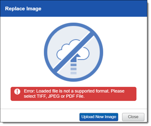 If an image already exists for a document, you can replace it by clicking the document name and selecting Replace images fore this document. In the menu, select the imaging profile you want to upload the new image with. Replacing the image with a supported image type replaces the entire image not just a single page of an image. For example, if you have a 5 page document, but you upload a JPG or TIFF file, you will have 1 image. If you upload a 5 page PDF file, then 5 images will upload.