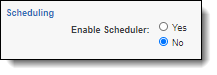 - From the Import Scheduling section under Enable Scheduler, select No.This disables the scheduling mechanism for that integration point.
