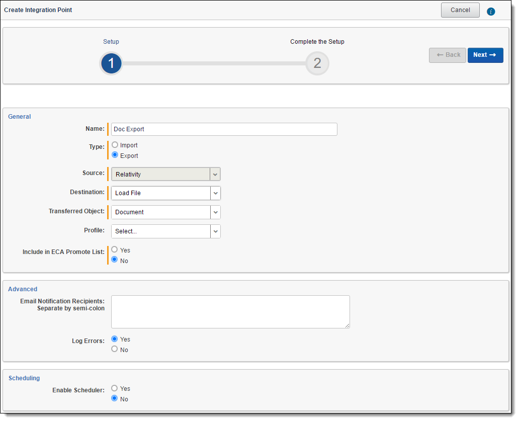 - Email Notification Recipients - enter the email addresses of those who should receive notifications of whether the integration point export succeeded or failed. Use semi colons between addresses.