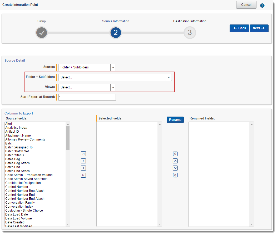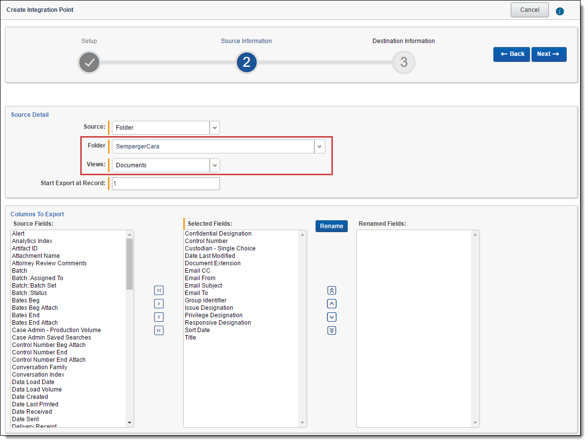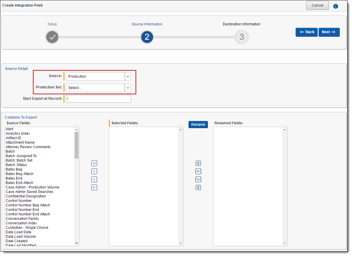 - Source Fields | Selected Fields | Renamed Fields - choose the fields that you want to export by moving them to the Selected Fields box. The box on the left displays all available source fields. The fields listed in the Selected Fields column are determined by what you select for the Source field above, as well by the folder, production set, or saved search that you select. Only the fields in the Selected Fields box on the right will be exported when you run the integration point. If you wish to rename the fields in your load file before exporting them, you can do so through the Rename option described below. The fields whose names you change are displayed in the Renamed Fields column.