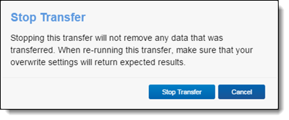 Relativity then informs you that you won't be removing any data by stopping the transfer and that you should check to make sure that the overwrite setting you previously entered is still appropriate for the re-run.