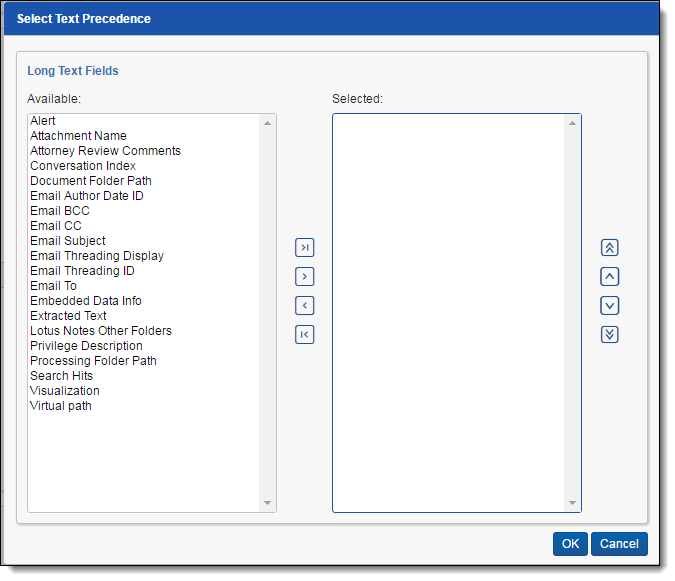 - Text Precedence - select and assign an order to long text fields that Relativity checks for text when performing an export. You must select one or more long text fields to use this functionality. Click the ellipsis to display the Pick Text Precedence pop-up. To move fields between columns, highlight them and click the Right or Left single or double arrows. Use the Up and Down arrows to order the precedence of the fields.