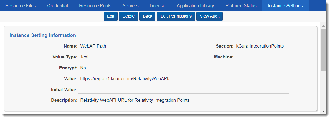 • The WebAPIPath instance setting in the kCura.IntegrationPoints section configured correctly. Note that this path is case sensitive.