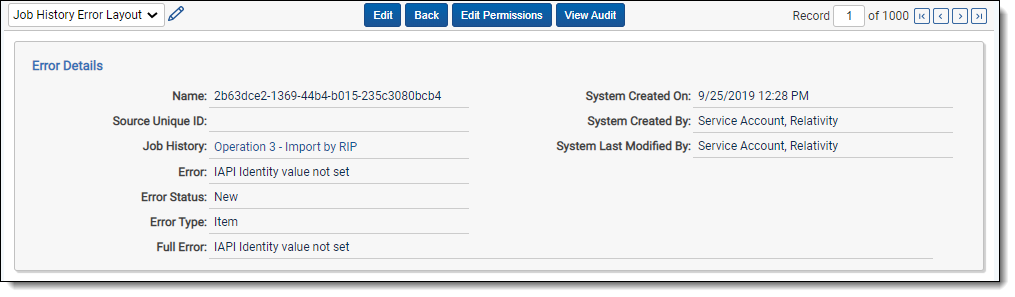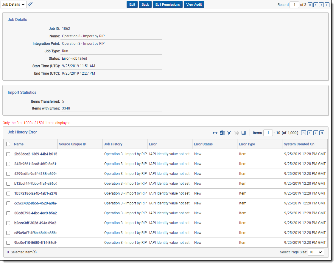 - Error - Job Failed - a job-level error occurred and the import wasn't completed. The integration point may have been able to import some of the records before the error occurred.