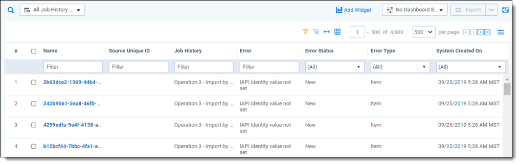 In the Job History Errors tab, you can use the condition lists at the top of the view to find errors based on any error-related metadata fields, such as Artifact ID, Error, Error Status, Error Type, JobHistory, Name, Source Unique ID, Stack Trace, System Created By, System Created On, System Last Modified On, and Timestamp (UTC).
