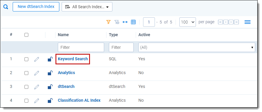 - Name- the name of the keyword search index. The name is the display name for the index.