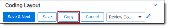 - If you click Save or Cancel, the layout appears as read-only and the Copy is disabled. You can click Edit to restart the review. You must then code the first document, and click Save & Next before the Copy button is enabled. Whenever you leave Edit mode or select a different layout, you need to repeat this process.