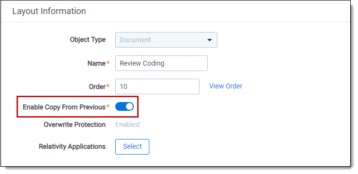 You can design a layout to include the Copy from Previous toolbar. This enhances review by providing the ability to copy coding values from one document to another within a review session.