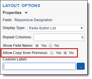 - Ensure that all applicable fields on the layout have the option Allow Copy from Previous set to Yes. If those fields are set to No and you want their values to be copied during review, set the Allow Copy from Previous option to Yes. If you need to remove the Copy from Previous option from a layout click Disable Copy from Previous. This button only becomes available after you add the toolbar to a layout.
