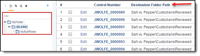 • If a folder path contains one or more empty folders, then Relativity replaces the blank location with the name in the Empty folder path placeholder field. For example, it updates the folder path MyFolder\\MySubfolder to MyFolder\[BLANK]\MySubfolder, if the name in this field is [BLANK].