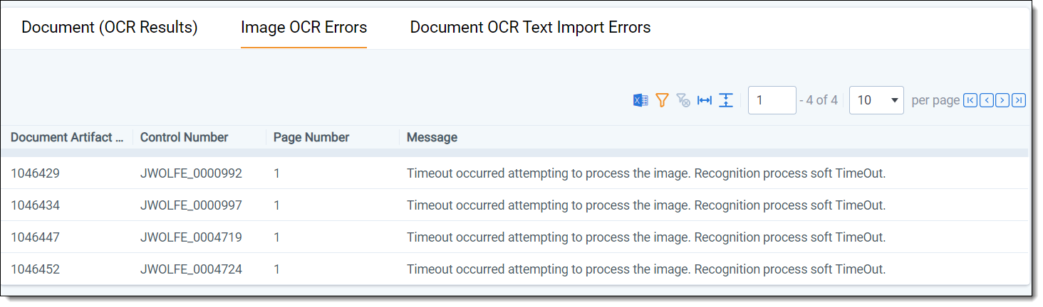In addition, it's possible to see Image OCR Errors or Document OCR Text Import Errors in the same tabbed display as Document (OCR Results).