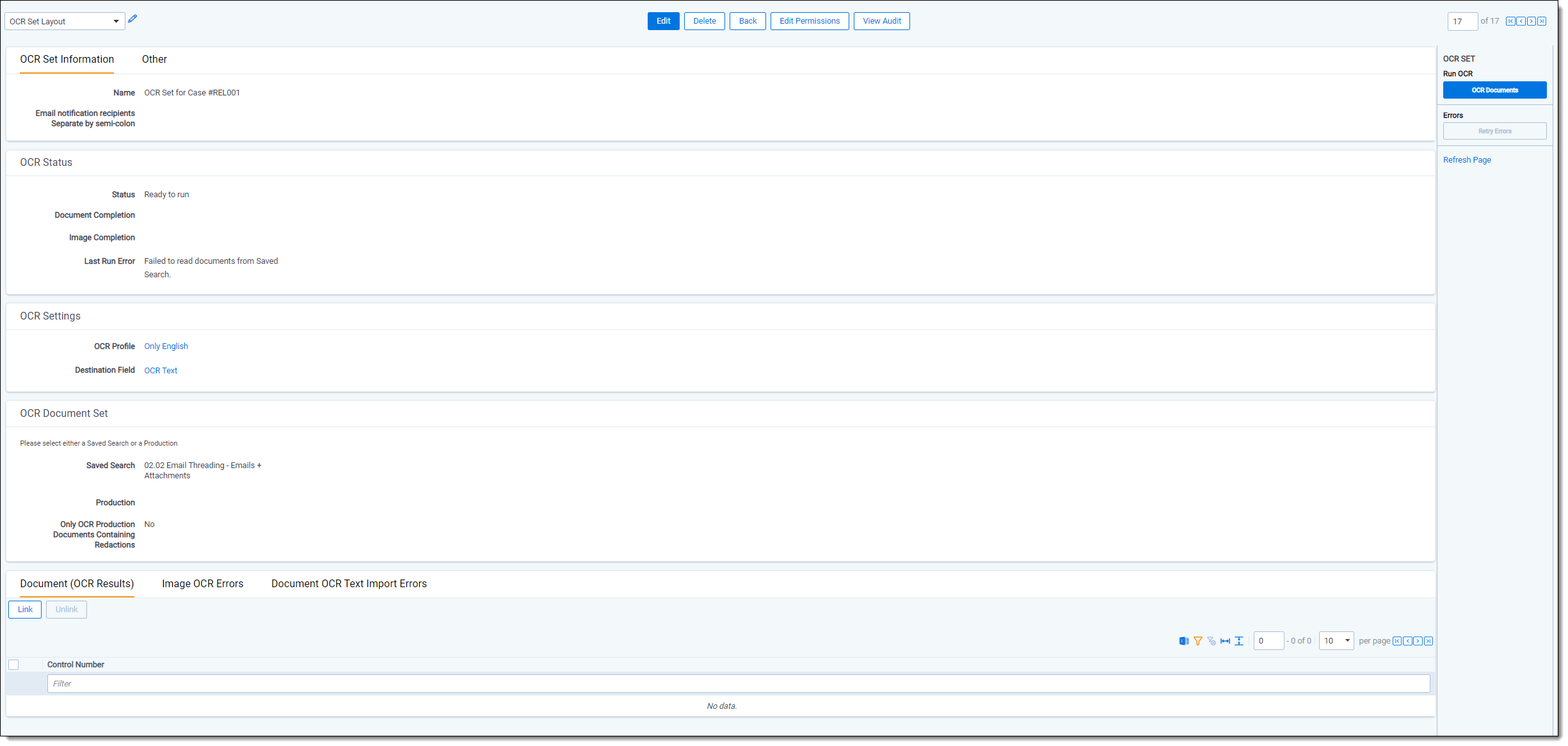• If an OCR set is in a status of Completed with errors and the data source is modified (i.e. the OCR set is updated from a Saved Search to a Production Set), the OCR set will reset to a status of Ready to run and cannot be retried.