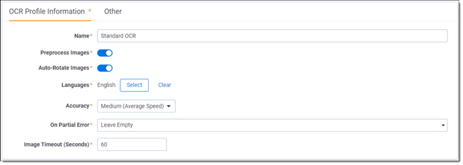 An OCR profile is a saved, reusable set of parameters that you use when creating an OCR set. To run an OCR job, you must first create an OCR profile.