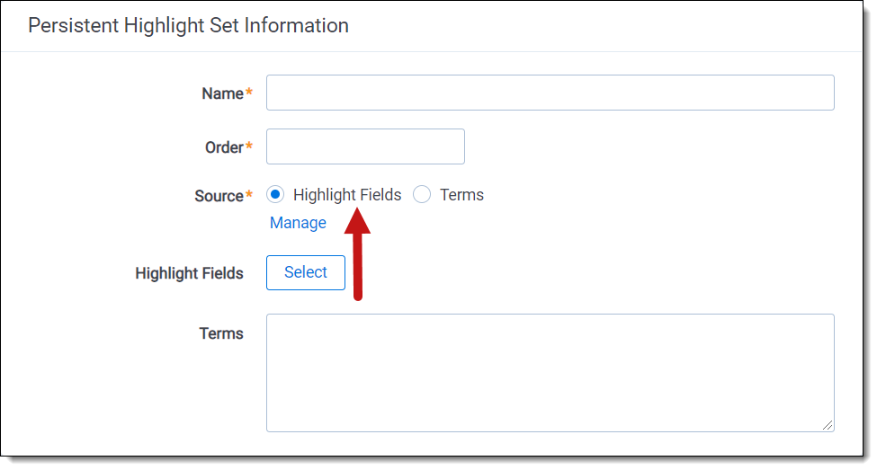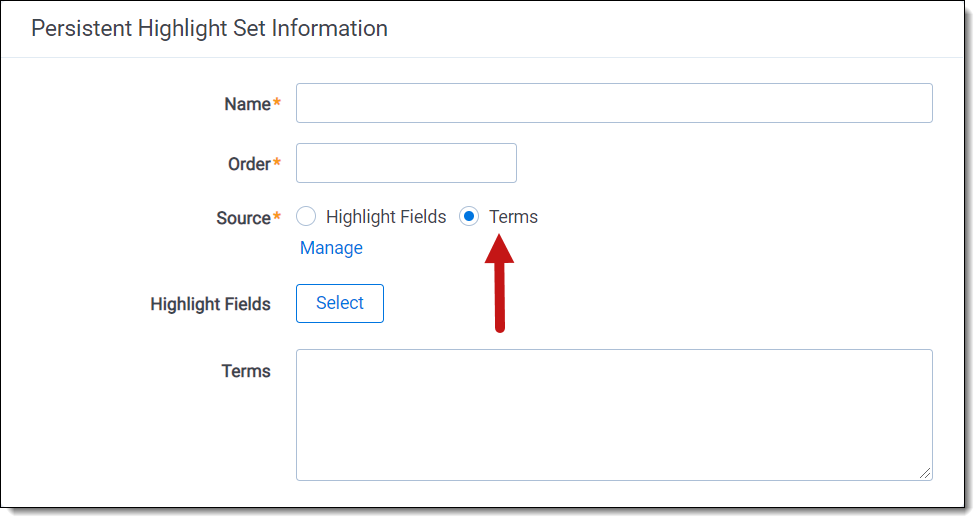 Creating efficient searches improves the performance of persistent highlighting, whether you're working with a Terms Search or Highlight Fields. Use the following guidelines to create efficient searches.