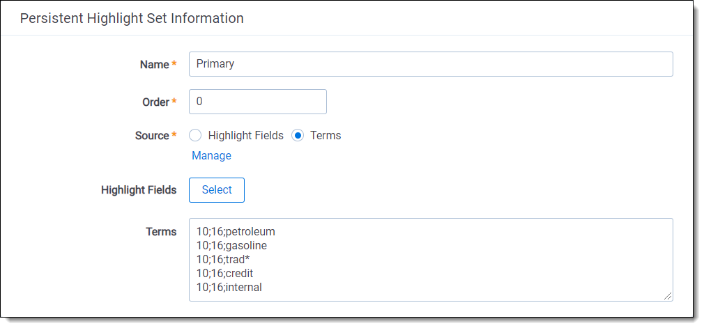 - If the list of terms is large (>100 terms), use Highlight Fields with a Search Terms Report. For more information, see Search terms reports.