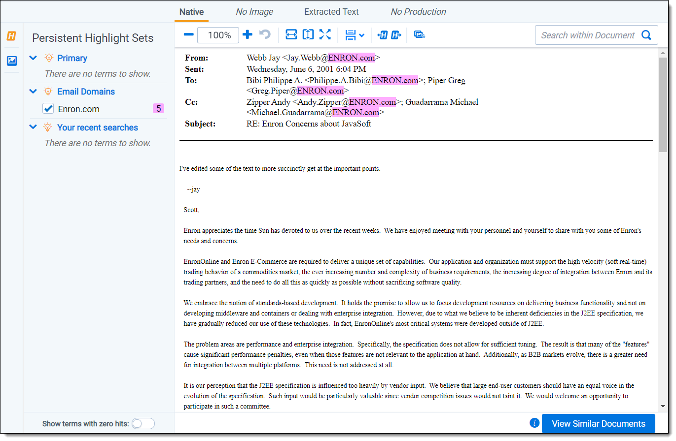 - Persistent highlight does understand proximity searching. If you enter the phrase Relativity w/5 software as a search term, the search term report uses a dtSearch to find and tag all documents that meet the criteria. When viewed in the Viewer, the persistent highlighting functions as a dtSearch.