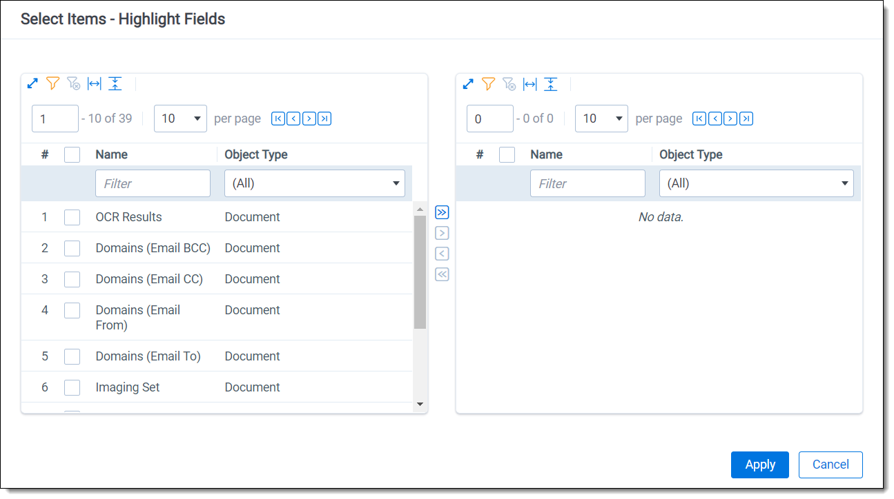 Select the Highlight Fields option, and then click the Select button to open the Select items - Highlight Fields modal. This system view displays the Name and Object Type for applicable multiple object fields, including those created by Search Terms Reports.
